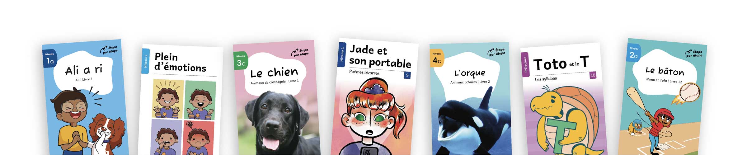 La collection Étape par étape a été développée pour l’enseignement de la lecture en classe ou auprès d’apprenants ayant des difficultés. De 20 à 40 livres présentent tous les sons de chacun des niveaux. Avec des histoires tout aussi intéressantes, les sons sont abordés de façon plus graduelle avec l’introduction d’un nouveau son seulement par livre. Utilisez les livres dans l’ordre qui vous convient ou suivez l’ordre proposé.