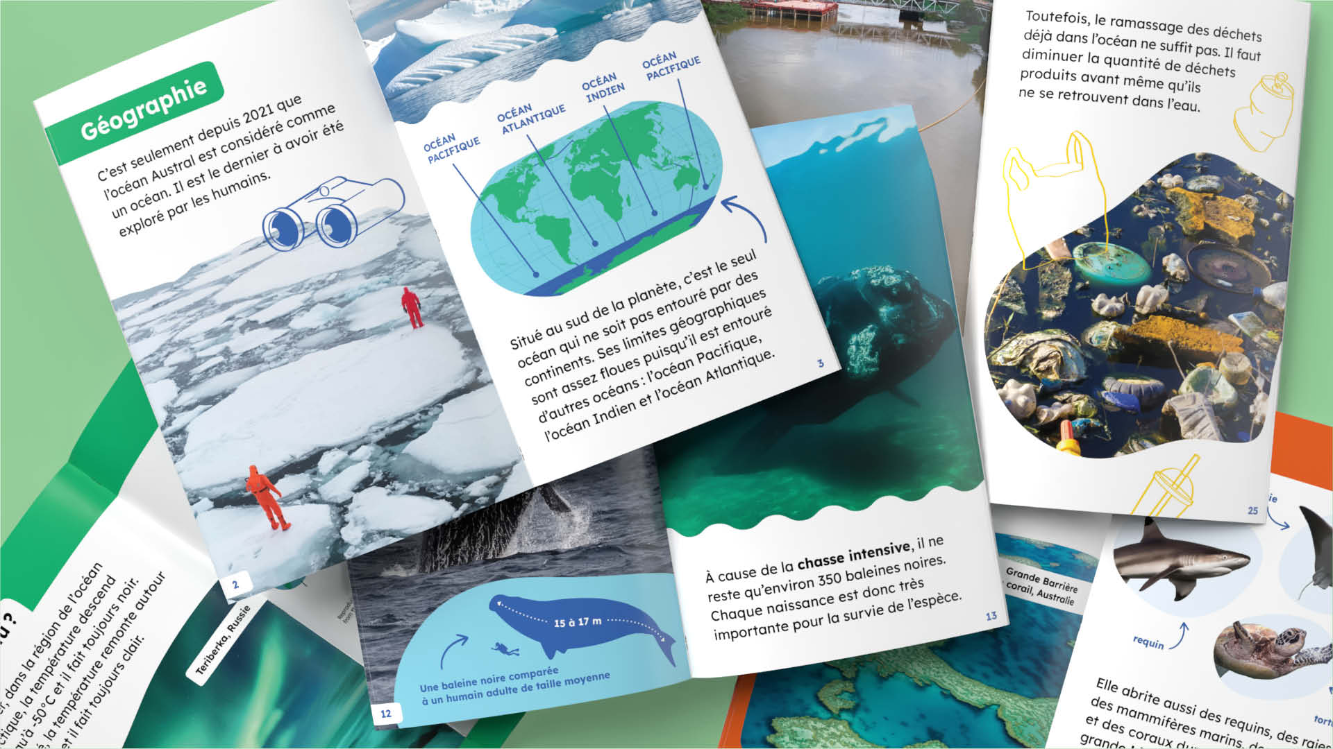 - ✅ 5 livres illustrés en couleurs, chacun dédié à un océan (Pacifique, Atlantique, Indien, Arctique, Austral)