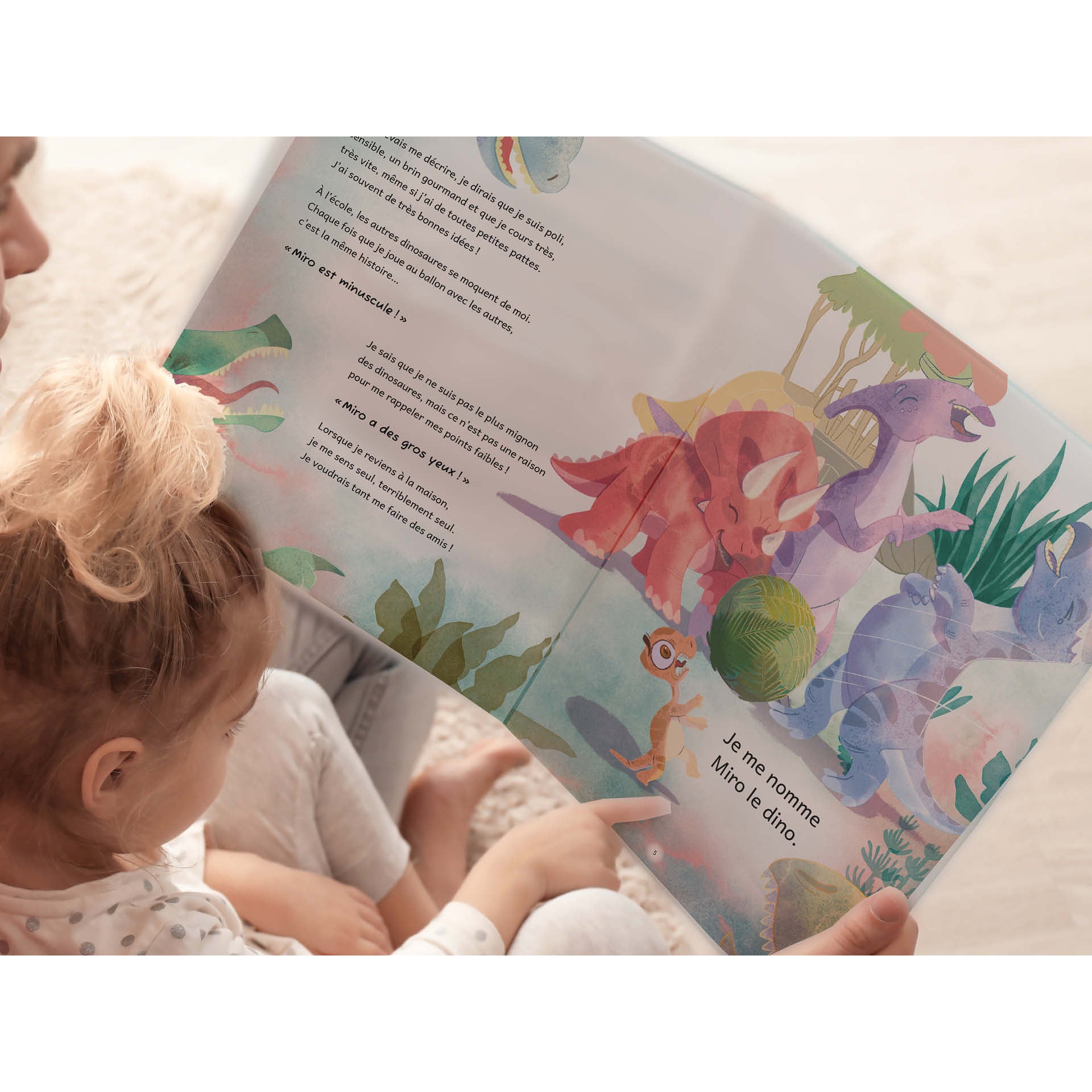Miro le dino, tome 1 – Chercher son cri est un album à lire en tandem, une page pour l’adulte et une phrase pour l’enfant. La phrase de l’enfant ne contient que des sons simples et des lettres sans accent. C’est un moment privilégié pour favoriser l’amour de la lecture !